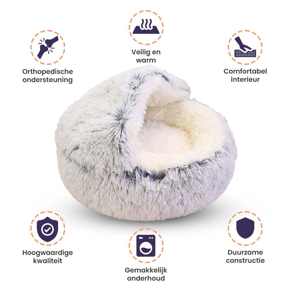 Veel honden ervaren stress of onrust, vooral wanneer ze alleen zijn of na drukke dagen. Dit bed biedt hen een plek waar ze zich instinctief veilig voelen. Dankzij de diepe structuur en fluweelzachte materialen krijgt je hond het gevoel beschermd te worden – vergelijkbaar met hoe wij onder een warme deken kruipen. Bovendien blijft het bed stevig liggen, is het eenvoudig te verplaatsen en geschikt voor gebruik in elke kamer of auto.